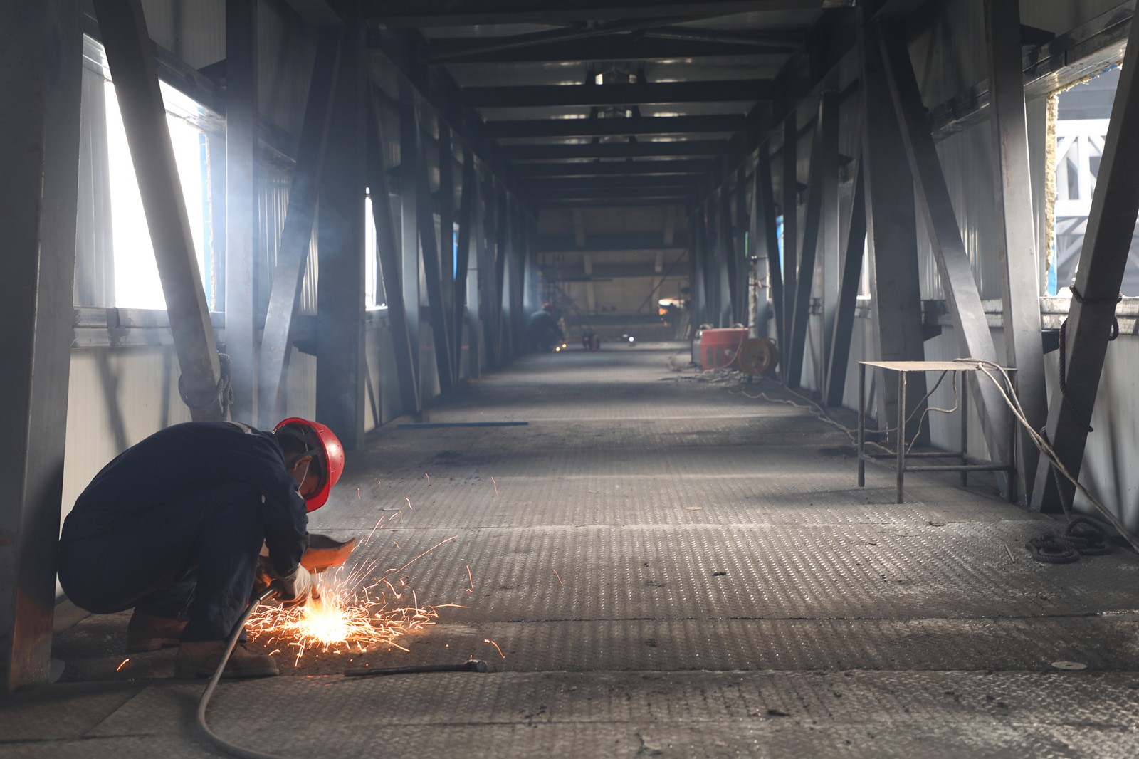 当前,栈桥主体部分已成型,机电制造分公司正紧锣密鼓地进行内部地面钢板的全面焊接工作,旨在增强栈桥的整体牢固性。后续,栈桥将移交至嘉阳煤矿进行内部皮带运输机组的安装。栈桥施工成型,推动了煤炭分级转运系统建设,为嘉阳政府煤炭储备设施改造项目的竣工创造必备条件。
