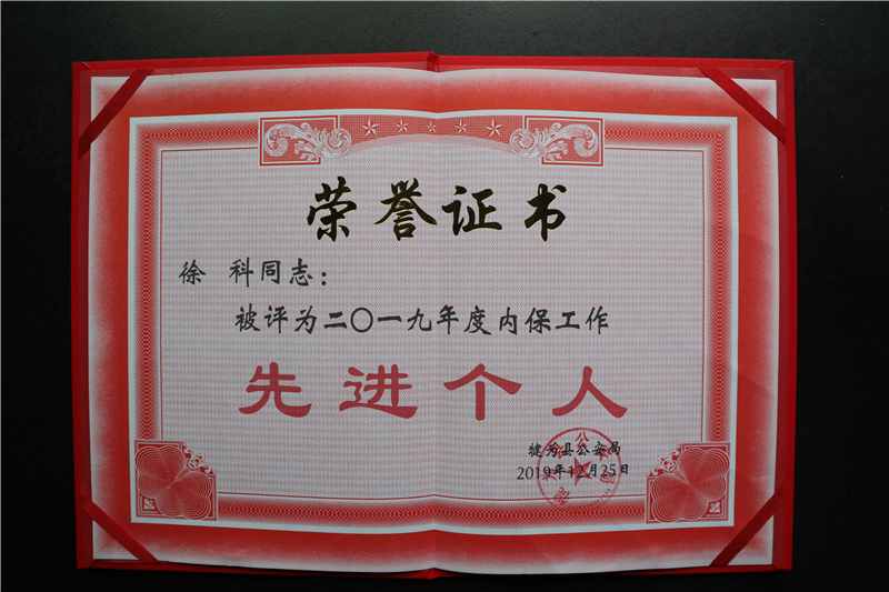 12月24日,犍为县公安局对2019年度单位内部治安保卫工作先进集体和个人进行表彰,华体会官方网页版,华体会(中国)单位榜上有名,被授予2019年度内保工作先进集体荣誉称号,保卫部徐科同志被评为2019年度内保工作先进个人。