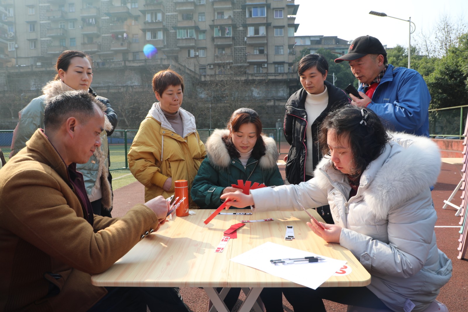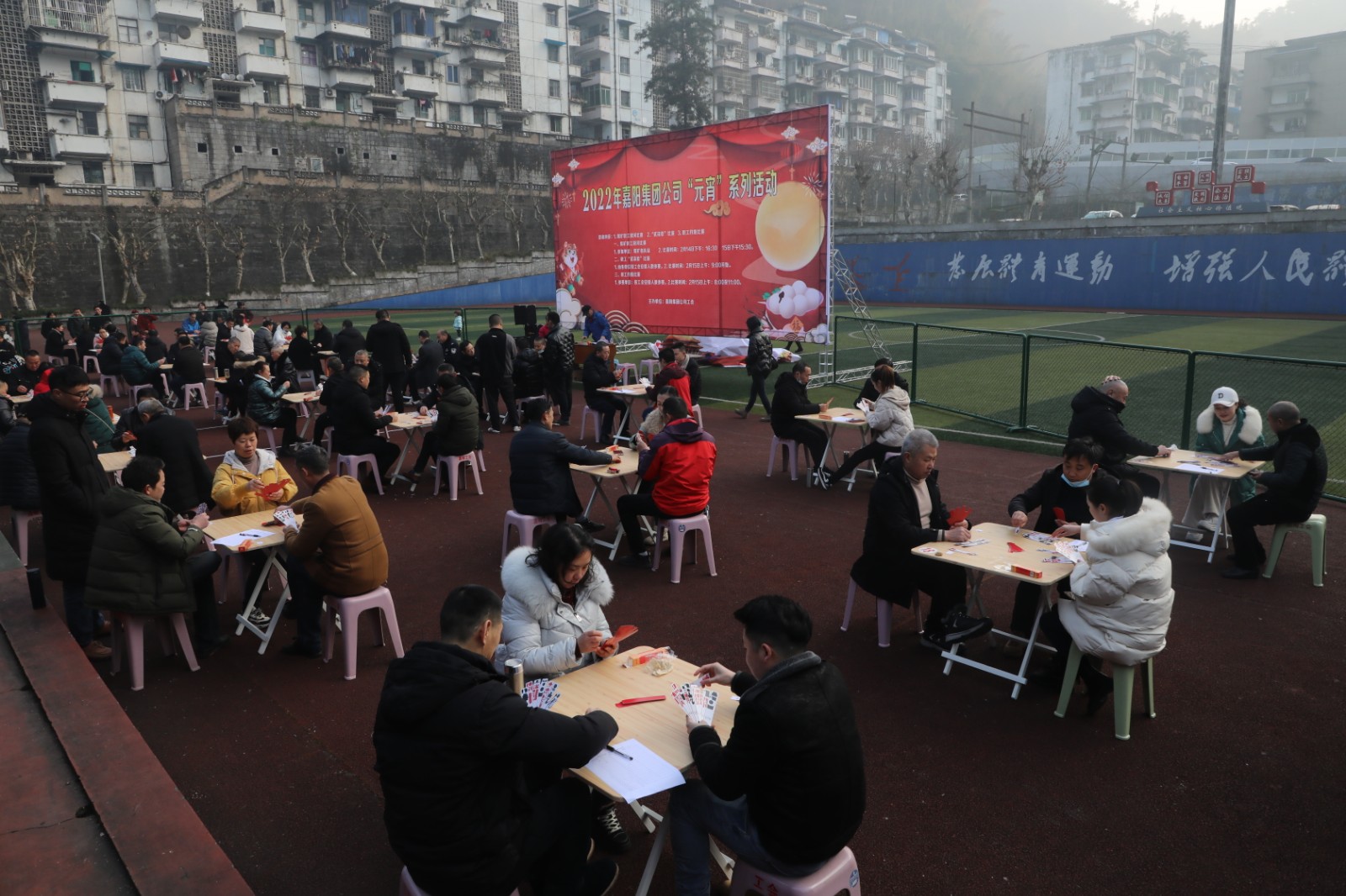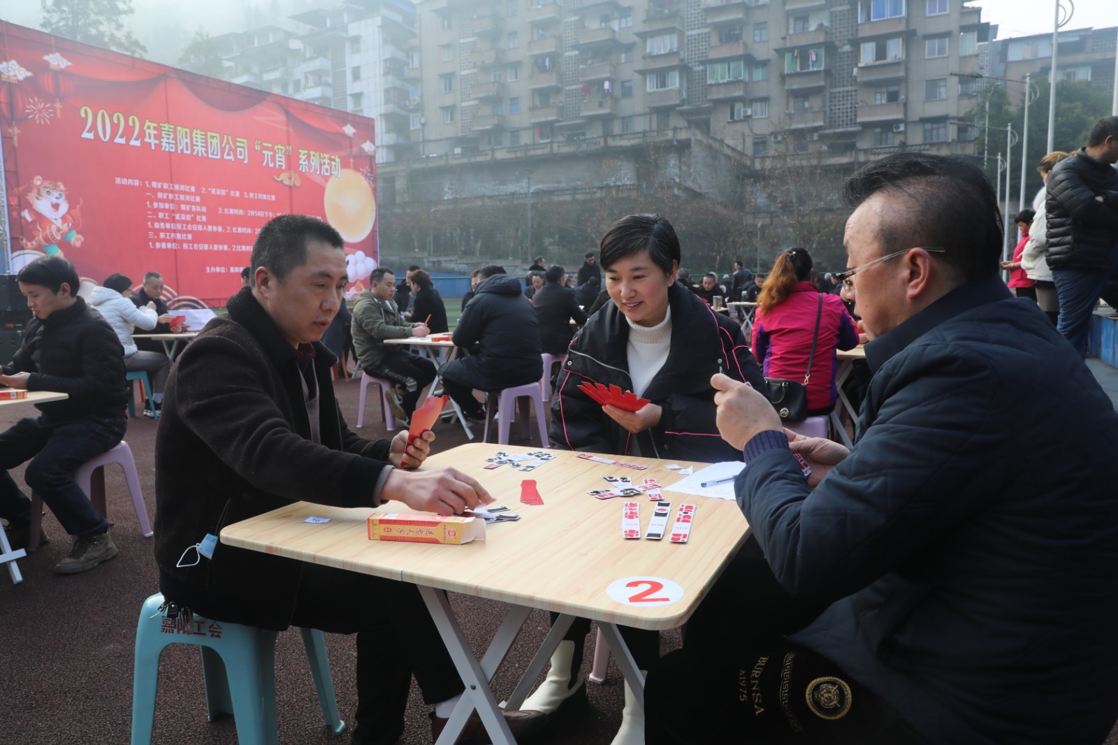 “贰柒拾”是职工们喜爱的娱乐形式。九点整,比赛在矿区官斗山足球场开始。比赛以淘汰制方式进行,81名选手分成27桌,比赛座位按抽签定桌,每桌决出第一名进入到下一轮,每轮比赛40分钟。扯牌、进张、听牌、和牌,场上千变万化,拼手气、比技术、赛心态,趣味无穷、欢乐多多,上一盘“抬了炮”没关系,下一盘争取和个“圈坤大”……选手一边“扯着”手中的牌,一边嘻嘻哈哈,气氛融洽。经过四轮比赛,最终来自综司的陈朝才、何羽分获一、二名,嘉阳煤矿的徐艳英获得第三名。