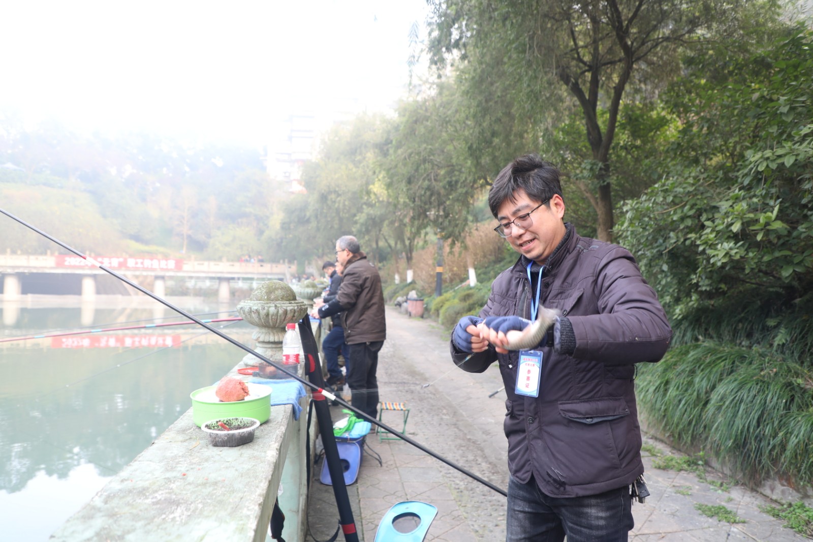矿区观音溪钓鱼比赛现场热闹非凡。15日早上7:30,经过现场抽签后选手们进入各自的钓位,撑杆、挂铒、抛钩一气呵成,静待鱼儿上钩。薄雾散去,当温暖的阳光照耀水面,鱼儿似乎才开始活跃起来,“嘿,咬钩了、咬钩了,还是条大鱼,稳住……”只见钓杆如弓,参赛选手憋着劲身子左右摆动,时而前进时而后退,神情紧张但却不慌乱,再看鱼儿拍水,时而下潜,时而翻滚,不一会的功夫,已经没有了力气,乖乖地被提起放进鱼护。钓鱼之乐不仅在于享受收获时带来的小欢喜,更多的是能拥有一份悠然自得和平静闲暇的心境。经过三个小时的角逐,嘉阳煤矿一队获得第一名,公司机关获得第二名,煤矿二队获第三名。
