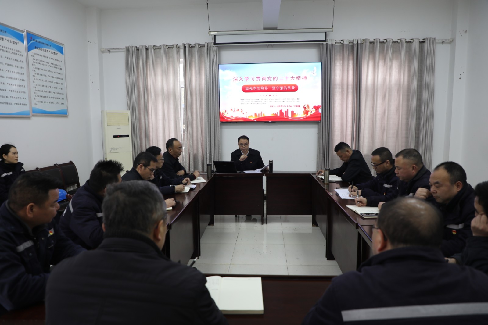 宣讲以《学习贯彻党的二十大精神 加强党性修养 坚守廉洁从业》为题,结合党的二十大精神和省委十二届二次全会精神的深刻内涵和核心要义,以报告中坚定不移全面从严治党为主基调,深入剖析了中央八项规定精神、四风问题、隐形贪腐以及如何建立基层党组织廉洁长效机制等方面内容,指出全面从严治党是抓好基层支部组织建设、纪律建设、作风建设的重点任务和永恒课题。党的二十大对全面从严治党的论述内涵深刻,意义重大,对全党同志提出了明确要求,也为全体党员干部、党建工作提供了根本遵循。全体党员干部要坚定“两个确立”、强化“四个意识”、坚持“四个自信”,坚决做到“两个维护”,讲政治、守规矩、作表率,自觉为党和人民事业增添正能量,做全面从严治党的支持者和模范践行者。要深入学习贯彻党的二十大精神和省委十二届二次全会精神,做到学习领会更深刻、掌握精神更全面,贯彻落实上级决策部署和中央八项规定精神更坚决。要持续深入组织学习培训,把思想行动统一到党的二十大精神和工作部署上来。要强化主体责任,在规范化管理中狠抓制度执行,认真执行第一议题学习制度,严格落实相关制度要求,推动学习由被动变主动。要学用结合,学以致用,把理论学习与业务能力提升结合起来,与抓党风廉洁责任落实结合起来,与推动企业高质量发展结合起来,提高政治判断力、政治领悟力和政治执行力,加强政策研究,提升为福溪电厂服务的质量,拓展粉煤灰、石膏、炉渣的外部市场,切实推动粉煤灰公司高质量发展。